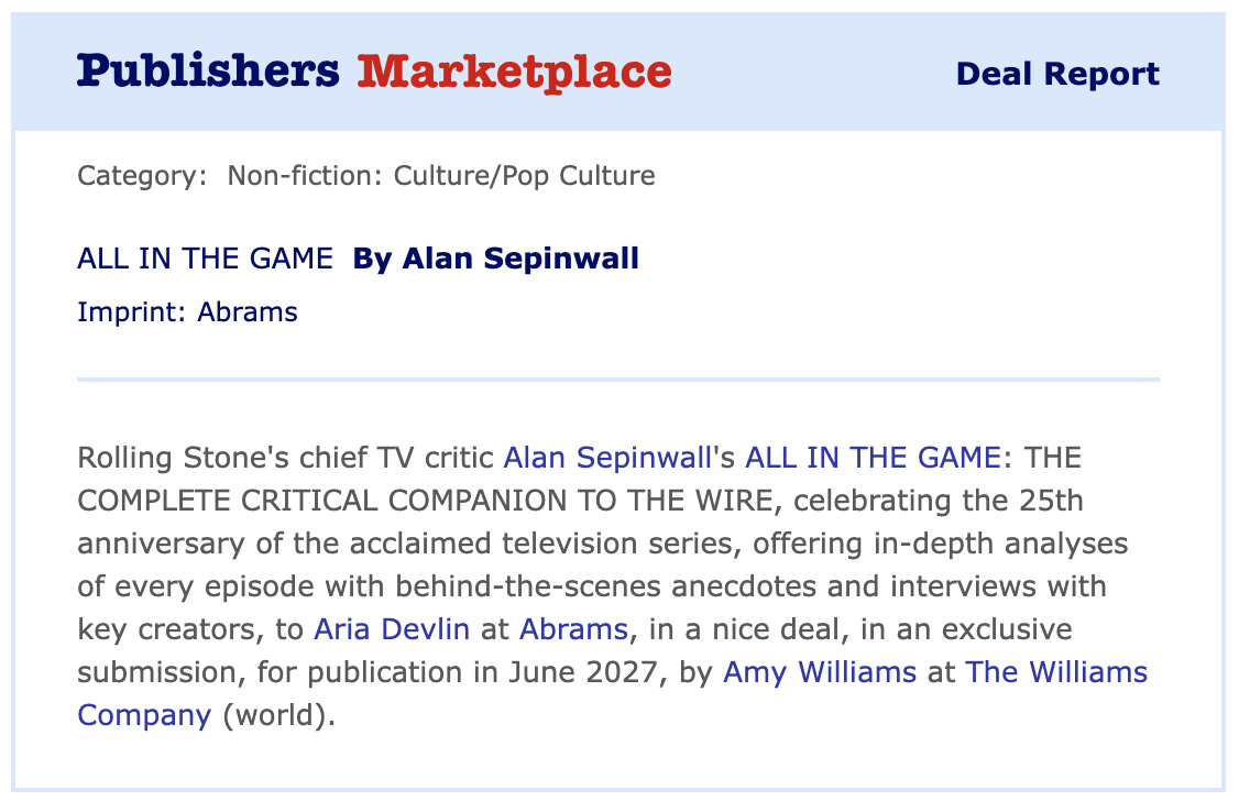 What we're tentatively calling All in the Game: The Complete Critical Companion to The Wire will, like my previous Abrams books about Breaking Bad, The Sopranos, and Better Call Saul, be an episode-by-episode look at the series, taking my original online recaps and either fleshing them out or rewriting them altogether, to provide a guide to watching the series, whether it's your first viewing or your 17th. There will also be some new interviews with people who worked on the show. And like the announcement says, it will come out in the summer of 2027, around the 25th anniversary of the series' debut. (Yes, 25. Insert gif of Private Ryan aging into an old man here.)